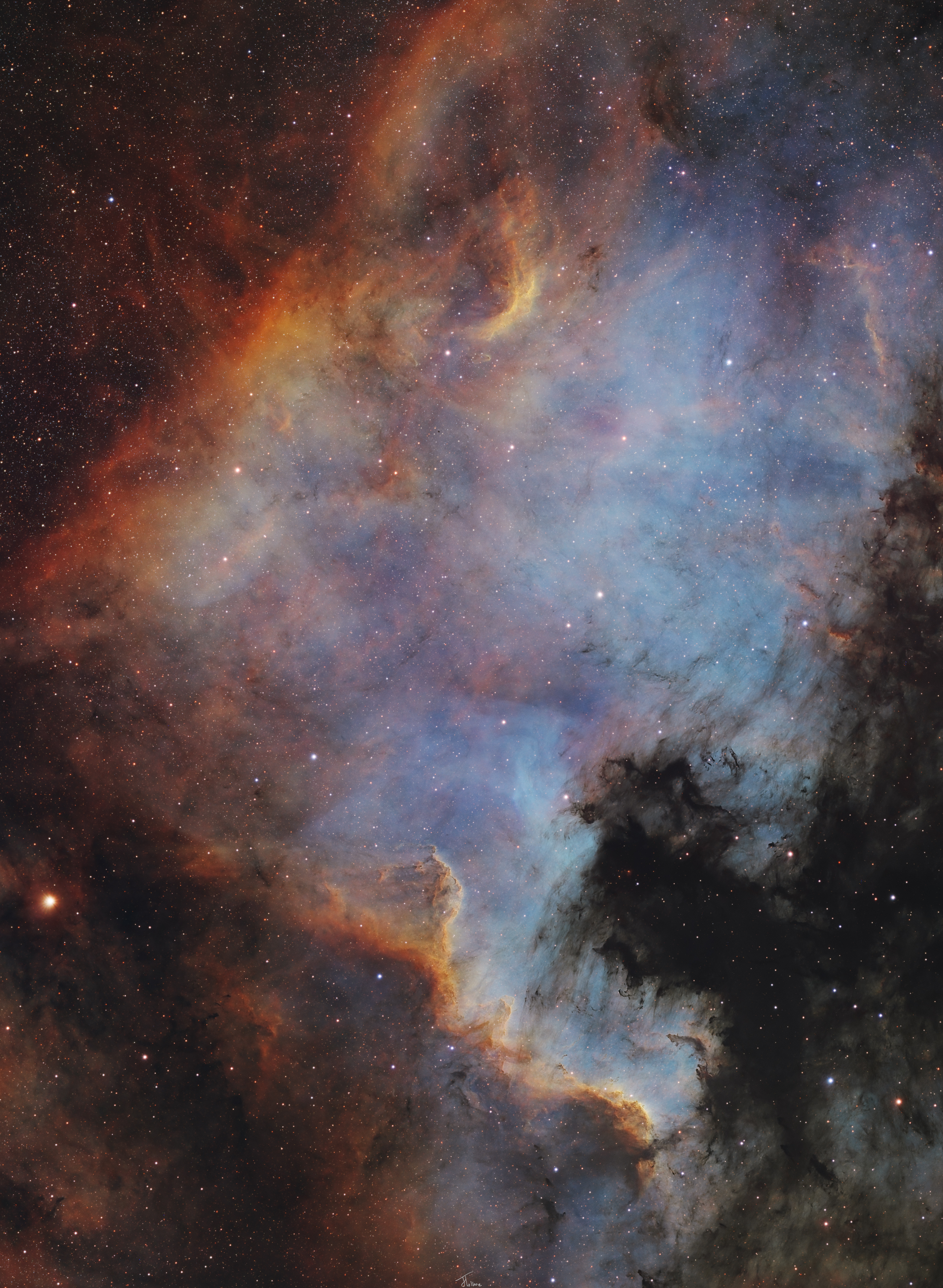 NGC 7000, known as the North America Nebula, is an emission nebula located in the constellation Cygnus, approximately 2,600 light-years away from Earth. It is named for its shape, which closely resembles the outline of the North American continent. The bright and intricate structure seen in the lower portion of this image is referred to as the Cygnus Wall.